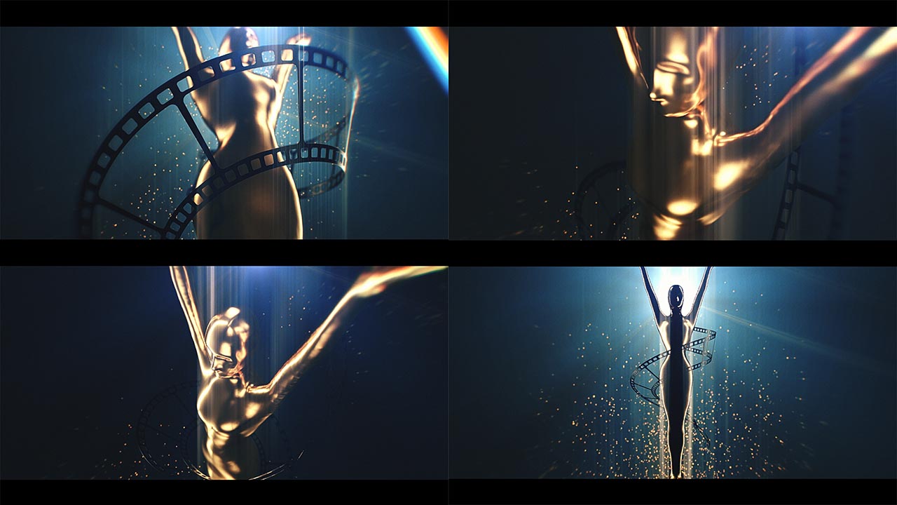 After modeling the statue I created a bunch of styleframes to find the right mood for the animation. Later on I decided to go for a solid gold look for the 35mm film strip as well.